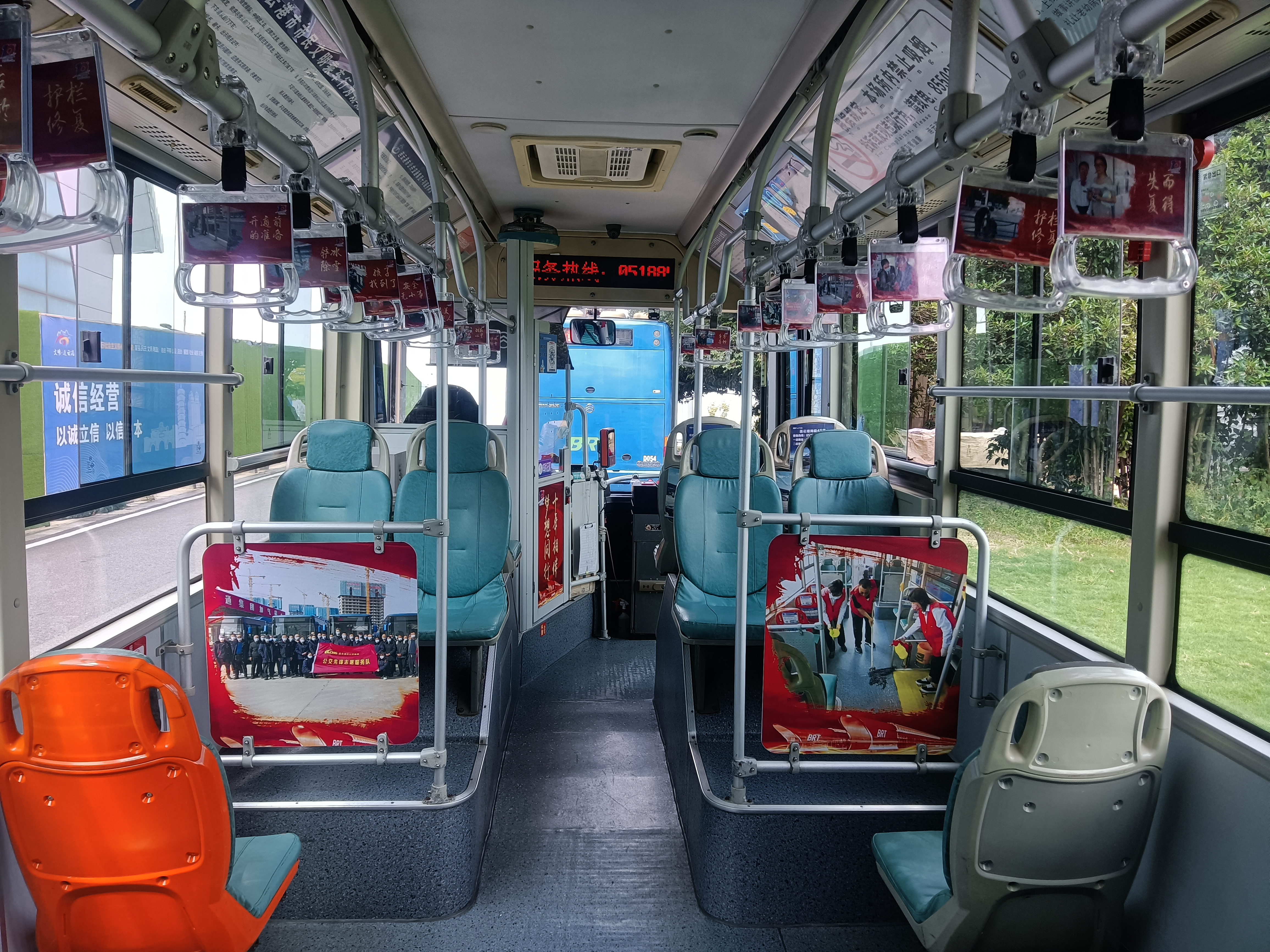 公交集團快速公交事業部選定主線的B1、B1K共4輛公交車分別以“快速公交成立十周年”“好人在身邊”為主題對公交車廂進行精心布置。在公交車內的拉手、座椅靠背、燈箱、擋板,推出了企業發展歷程、工作理念、獲得榮譽表彰;企業員工風采、公交文明創建、關愛社會好人好事等文化宣傳畫面。讓乘客切身感受到濃厚的企業文化精神,同時讓乘客在安全、舒適出行的同時,體會豐富多彩的公交車廂文化。在一幅幅生動畫面的裝飾下,整個車廂內洋溢著積極向上的氛圍,讓城市公交成為一座流動的宣傳站。