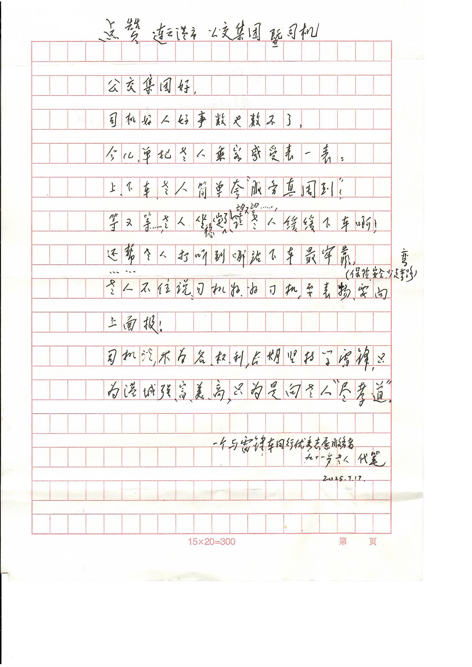 “司機好,好司機,要表揚!”老人在信中反復強調。面對老人的稱贊,司機師傅們卻謙虛表示:“不為名利,只是堅持學雷鋒,為港城‘強富美高’盡一份力,對老年乘客盡一份孝心。”