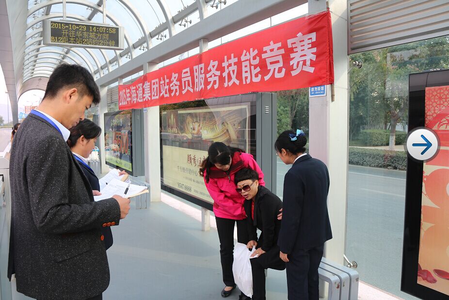 2015年10月29日,在海通集團(tuán)和海通公交的籌備和組織下,快速公交站務(wù)員服務(wù)技能競(jìng)賽活動(dòng)圓滿結(jié)束。本次技能競(jìng)賽分為理論考試和現(xiàn)場(chǎng)技能考核兩個(gè)部分。56名站務(wù)員參加初選,經(jīng)過(guò)嚴(yán)格選拔, 16名優(yōu)秀站務(wù)員被選拔出來(lái)參加決賽,決賽在郁海廣場(chǎng)上行站進(jìn)行,分為禮儀服務(wù)、售票操作、應(yīng)急處理、安全檢查等環(huán)節(jié)評(píng)比,并對(duì)站務(wù)員進(jìn)行綜合打分。