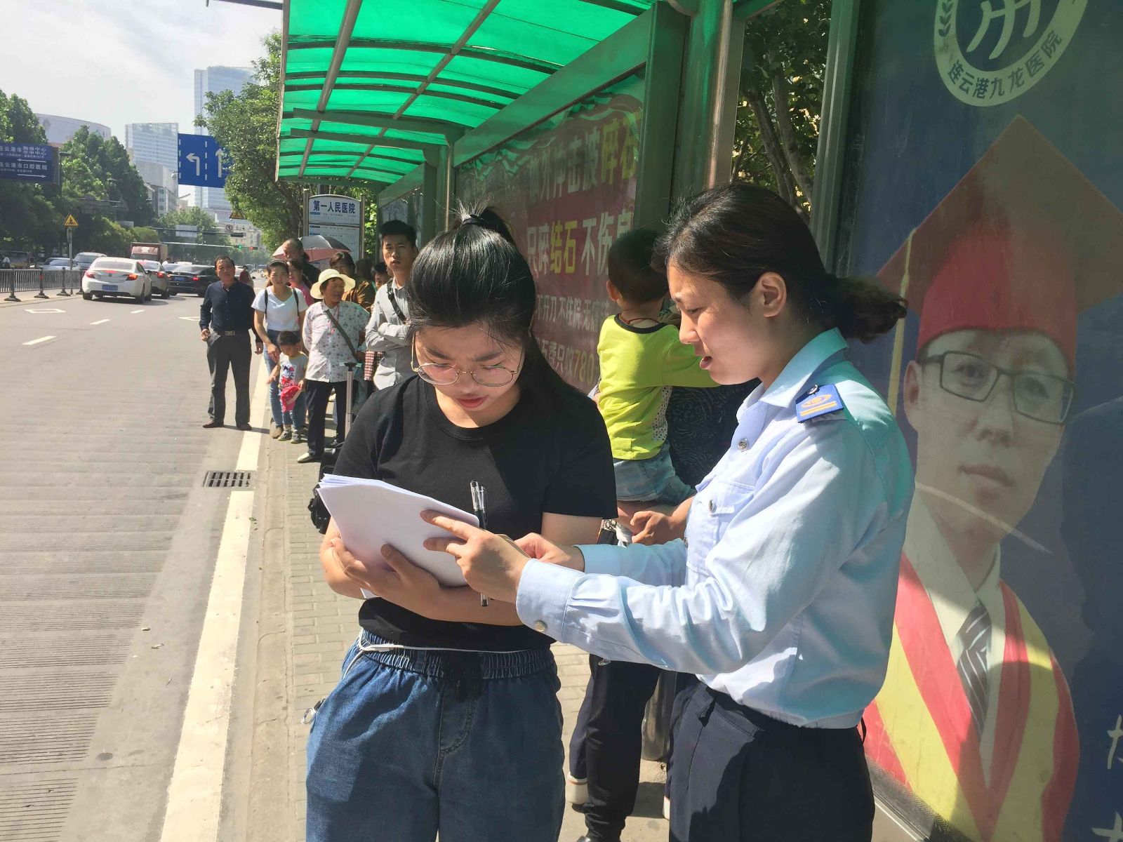 參加人員身著統一的工作服,佩戴紅色綬帶,由分公司經理宋洪祥帶領大家來到了客流密集的第一人民醫院站點,開展公交服務乘客滿意度調查問卷活動。