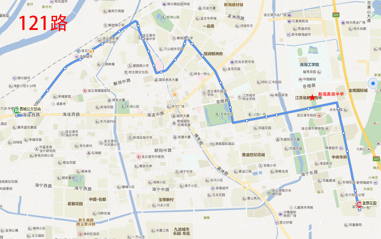 新海高級中學:地址在海州區蒼梧東路58號,附近途徑公交線路有3路、5路、10路、15路、24路、51路、121路、游2路;