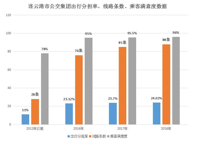 2012年之前,我市運(yùn)營(yíng)公交線路僅有28條,車輛數(shù)370臺(tái),社會(huì)承包車占比70%,車輛空調(diào)化率為23.7%,日均客流量為13.29萬(wàn)人次,出行分擔(dān)率為11%,社會(huì)滿意率僅為78%。經(jīng)過(guò)六年精心耕作,公交發(fā)展指標(biāo)得到大幅提升。