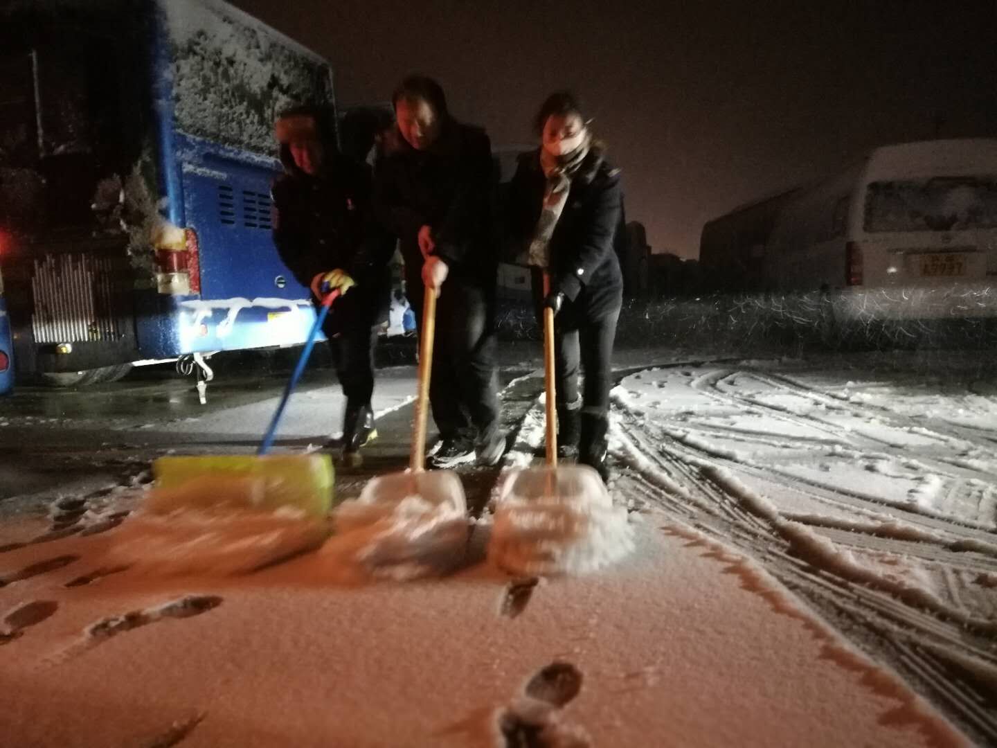 31日凌晨4點左右,公交集團各事業部領導班子、安管人員嚴格按照惡劣天氣應急預案和突發事件處置流程的要求奔赴各路段,檢查路面、橋段、涵洞積雪結冰情況,第一時間將道路狀況以電話、視頻、照片的形式反饋至各調度室和駕駛員,方便調整行車走向;全體駕駛員、站務員提前到崗,清理車輛、站臺、場站內的積雪,給車輛預熱,做好發車前準備工作;各場站相關負責人面對面做好駕駛員安全交代,叮囑駕駛員低速慢行、保持安全車距;運營人員在公交客流密集站、首末站,指揮疏導車輛,協助維持秩序,加強安全行車現場管理,確保不出現積壓客流的情況。