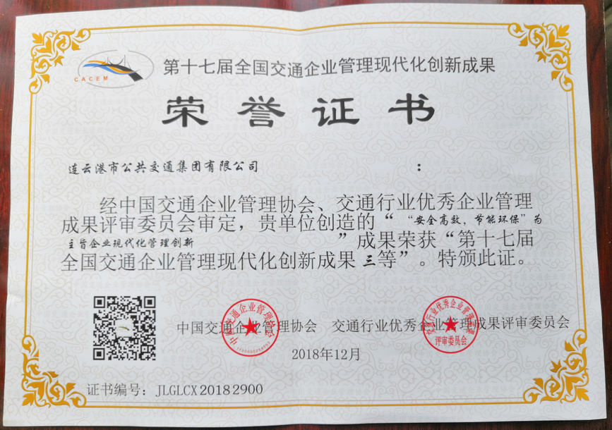 公交集團喜獲第十七屆全國交通企業管理現代化創新成果三等獎