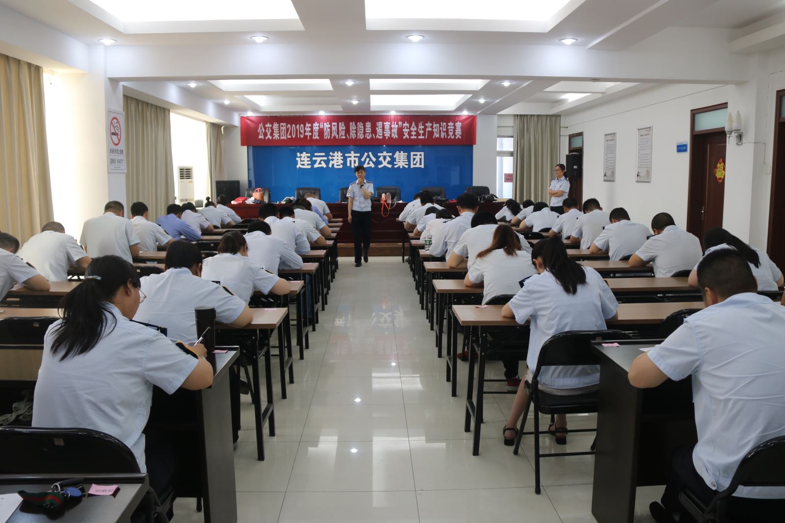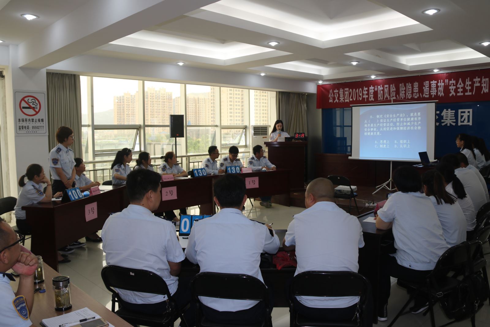 為扎實推進全國第十八個“安全生產月”活動的深入開展,全面加強安全生產宣傳教育,普及安全生產知識,提高職工安全素養和自我保護能力,6月27日,公交集團在三樓會議室開展了“防風險、除隱患、遏事故”安全生產知識競賽,集團黨委書記、總經理周文君,副總經理羅軍,副總經理、工會主席劉永善,各職能部門負責人及集團權屬單位領導班子、安全管理人員共70余人參加了此次活動。