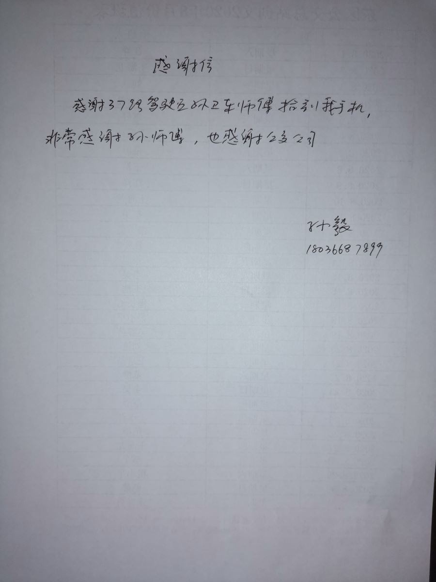 沒過多久,孫先生來到大港路停車場調度室領取了自己失而復得的手機,他非常激動地說,“孫衛東師傅服務態度很好,我經常乘坐37路公交車,非常感謝他”,他當場寫下感謝信,再次對孫衛東師傅表示萬分感謝,同時感謝工作人員的熱心幫助。